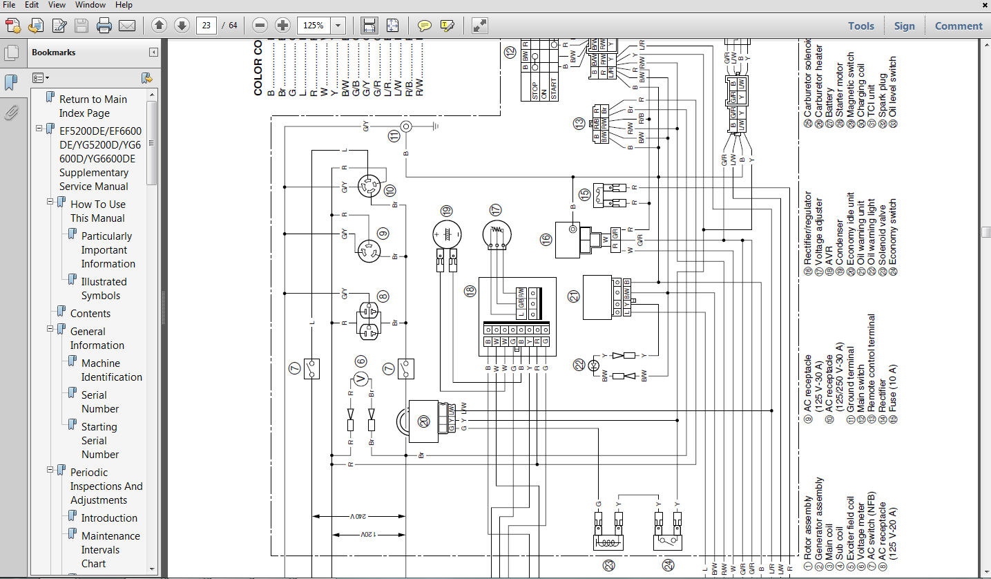 Yamaha EF4600A / EF6600A Generator Service Manual. The procedures in this manual are organized in a sequential, step-by-step format. The information has been compiled to provide the mechanic with an easy to read, handy reference that contains comprehensive explanation of all disassenbly, repair,assembly and inspection operations. Each chapter provides exploded diagrams before each disassemblysection for ease in identifying the correct disassembly and assembly procedures.